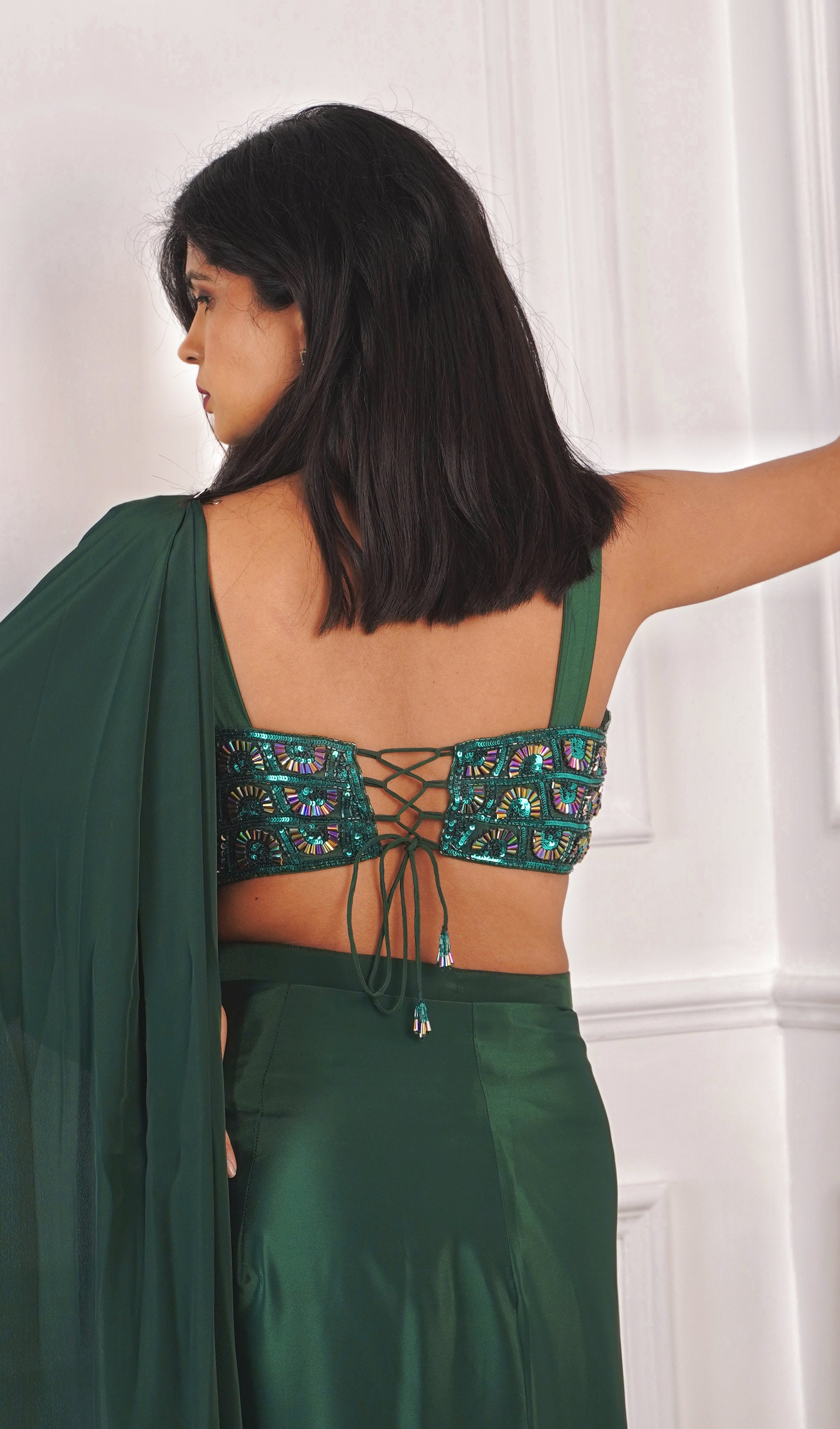 Forest Green Pre-draped Crepe Saree